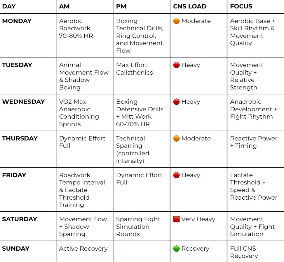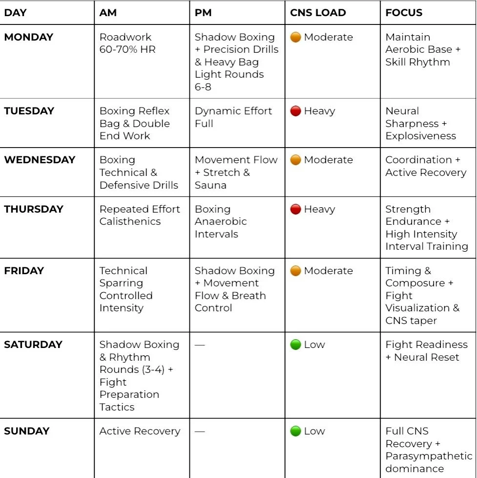 We begin the peaking phase about 1-2 weeks before fight day. During this time, absolute strength work is completely removed, and the focus shifts to repeated-effort training (65-85%) combined with calisthenics to maintain strength without accumulating fatigue. Dynamic-effort work is performed at lower intensities to preserve speed and explosiveness. The emphasis during this phase is on recovery, movement quality, skill refinement, and gradually tapering down conditioning to ensure the athlete reaches optimal readiness and physiological balance for peak fight performance.