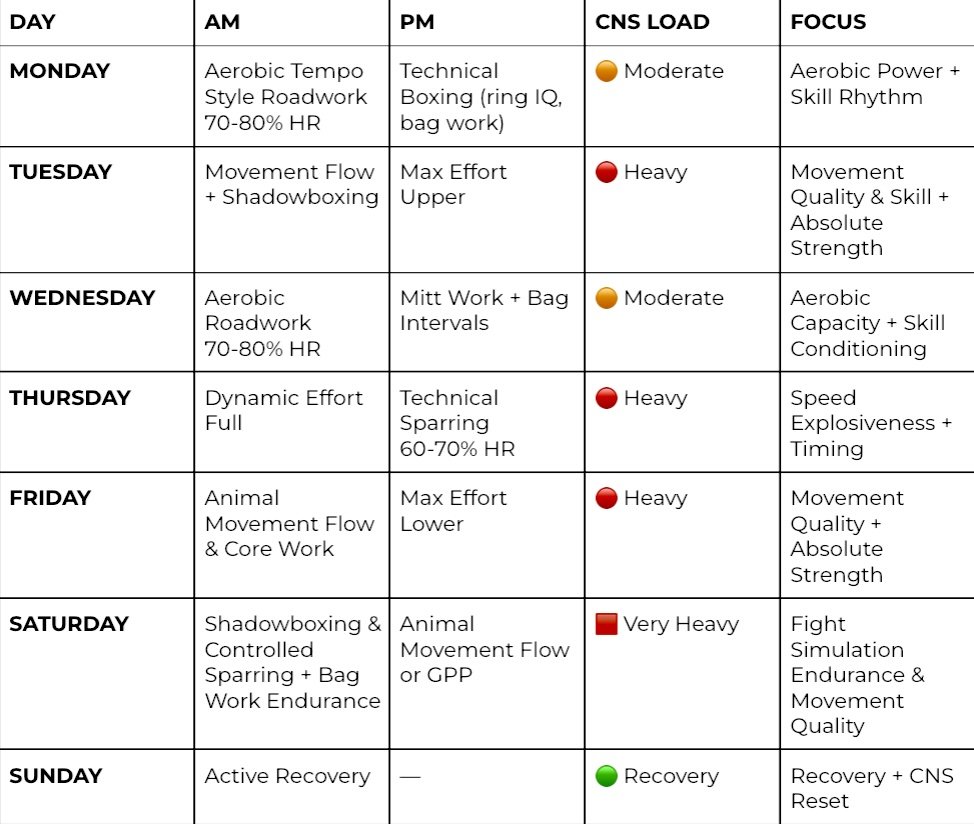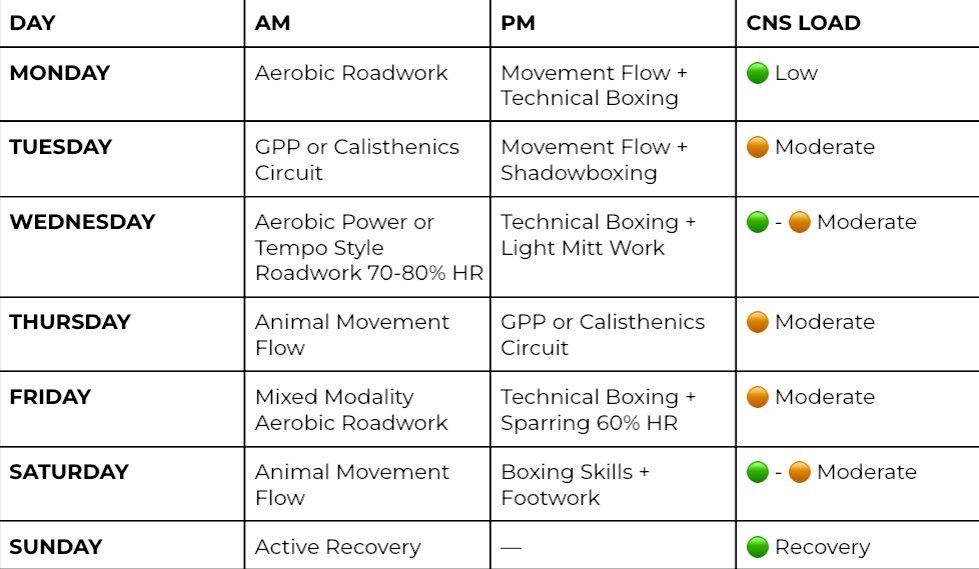 Note: This template focuses on aerobic development, general physical preparedness (GPP), and improving movement quality. Skills training will be conducted separately with a boxing trainer, not an S&C coach, for all templates below.